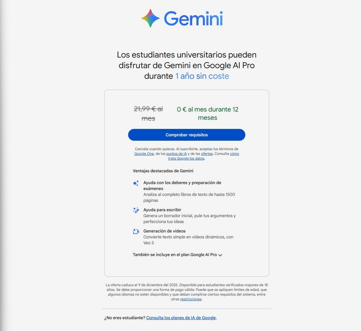 Una vez superada esa verificación, y completado el registro, podrás empezar a disfrutar de Google AI Pro gratis durante un año. Esta promoción estará activa hasta el 9 de diciembre, así que todavía tienes tiempo para hacerte con ella, pero no te despistes demasiado, no sea que al final se te acabe pasando.