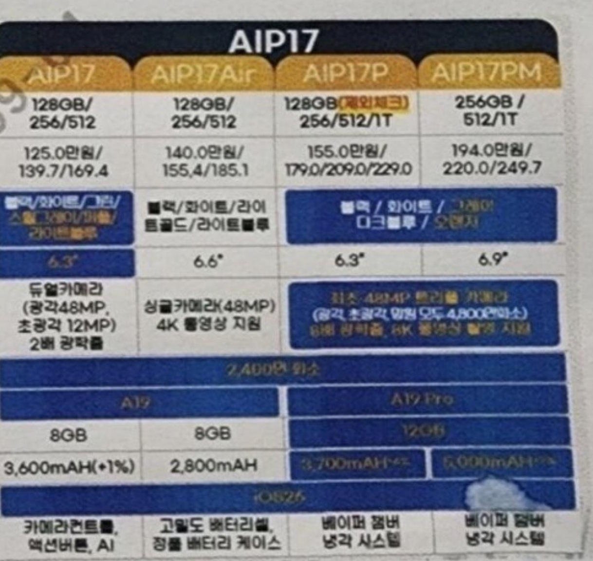 La información de KT Telecom confirma que no habrá modelo Plus este año, y que el modelo Air será su sustituto, algo que ya habíamos visto en filtraciones anteriores. Este modelo tendrá una pantalla de 6,6 pulgadas con panel AMOLED LTPO y tasa de refresco de 120 Hz, utilizará un SoC Apple 19 fabricado en el nodo de 3 nm de TSMC y tendrá 8 GB de LPDDR5X.