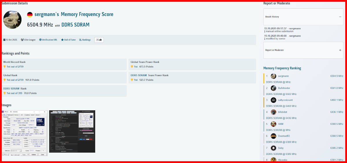 El overclocker Sergmann ha superado la barrera simbólica y técnica de los 13.000 MT/s en memoria DDR5, marcando un nuevo récord mundial con una velocidad exacta de 13 010 MT/s. El hito se ha logrado con módulos Corsair, un procesador Intel Core Ultra y, sobre todo, con la placa base GIGABYTE Z890 AORUS TACHYON ICE como centro de operaciones. Este resultado no solo representa una marca individual: sitúa a GIGABYTE en la cúspide del rendimiento en memoria, con el primer, segundo y tercer puesto en el ranking global de frecuencia DDR5.
