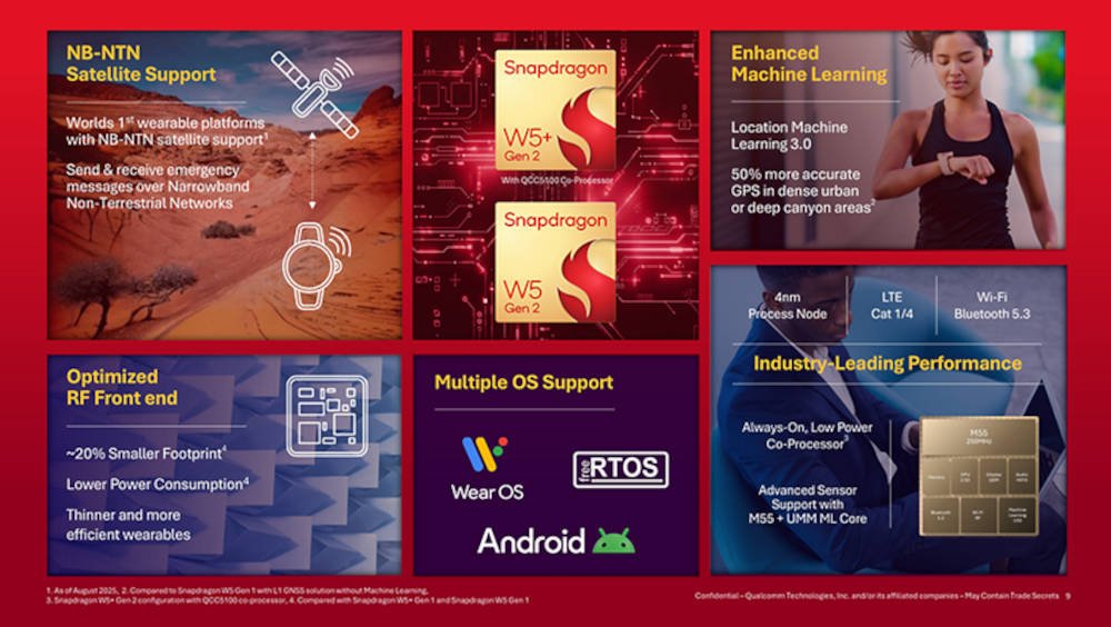La conectividad vía satélite se habilita a través de la tecnología NB-NTN (Non Terrestrial Networks), que permite enviar y recibir mensajes de emergencia en lugares sin cobertura móvil. Aunque todavía se trata de un servicio limitado en disponibilidad y uso, resulta una incorporación significativa en términos de seguridad y comunicación, especialmente para usuarios en entornos aislados. Qualcomm sigue así una tendencia ya marcada en el sector, pero la lleva directamente a la muñeca, lo que supone un paso más en la autonomía de los relojes inteligentes.