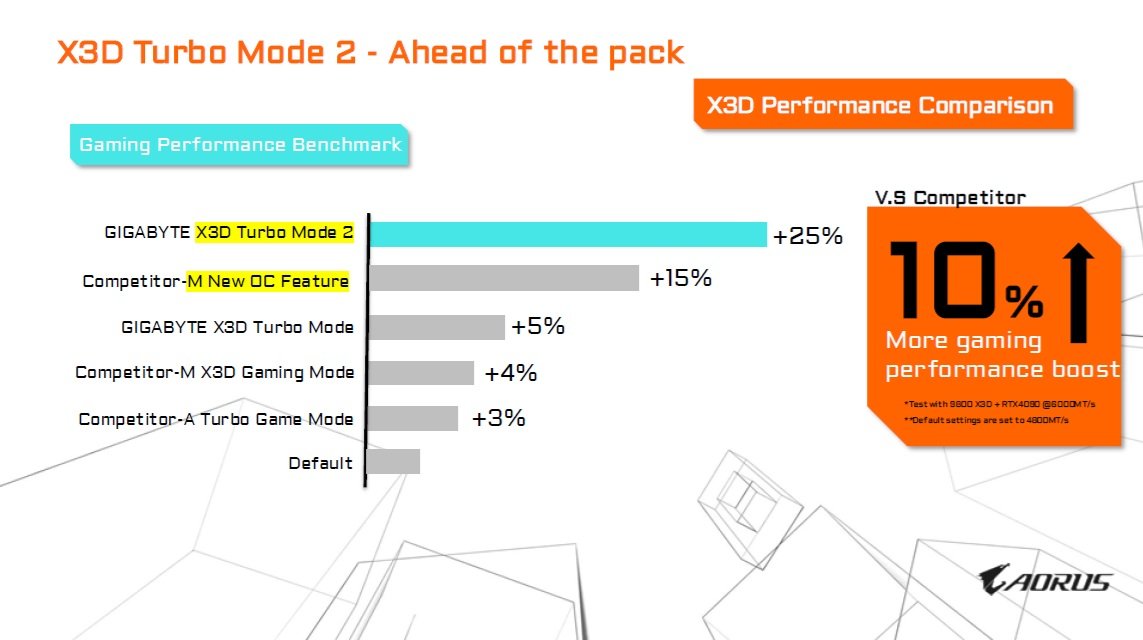 Otra de las claves más importantes que hay detrás de la serie X870E AORUS X3D es su tecnología X3D Turbo Mode 2.0, que utiliza inteligencia artificial para optimizar la configuración de procesadores con caché 3D de AMD y mejorar el rendimiento en juegos hasta en un 25%.